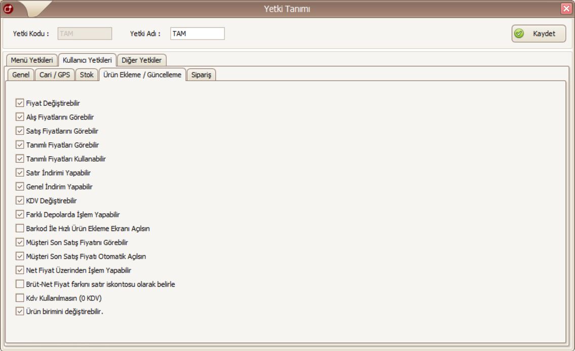 Tanımlı Fiyatları Görebilir: Kullanıcının, bir ürüne ait sistemde tanımlı olan fiyatları görüp göremeyeceğinin yetkisi bu parametre ile belirlenir.