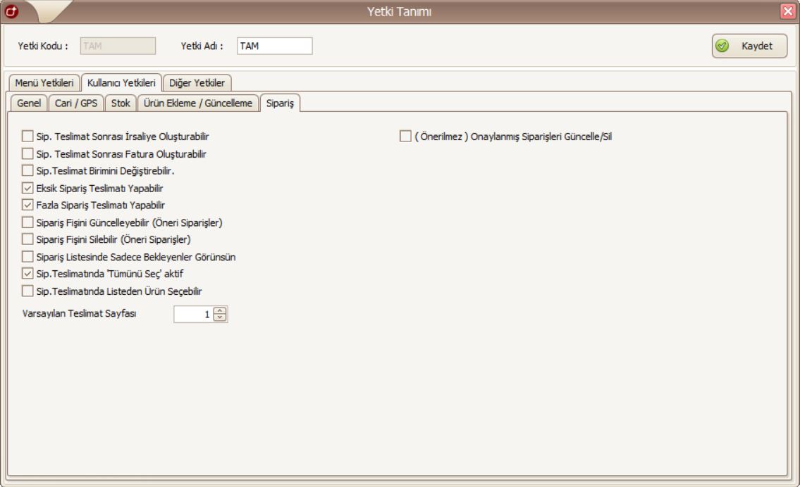 Eksik Sipariş Teslimatı Yapabilir: Kullanıcının sipariş miktarından daha az teslimat yapıp yapamayacağının yetkisi bu parametre ile belirlenir.